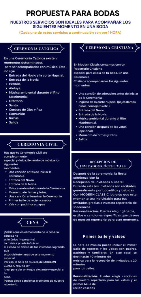 Con más de 800 bodas atendidas, MODERN CLASSIC es sinónimo de elegancia, emoción y confianza. Acompañamos tu ceremonia y recepción con un repertorio único, desde lo clásico hasta lo moderno, creando la atmósfera perfecta para tu gran día.